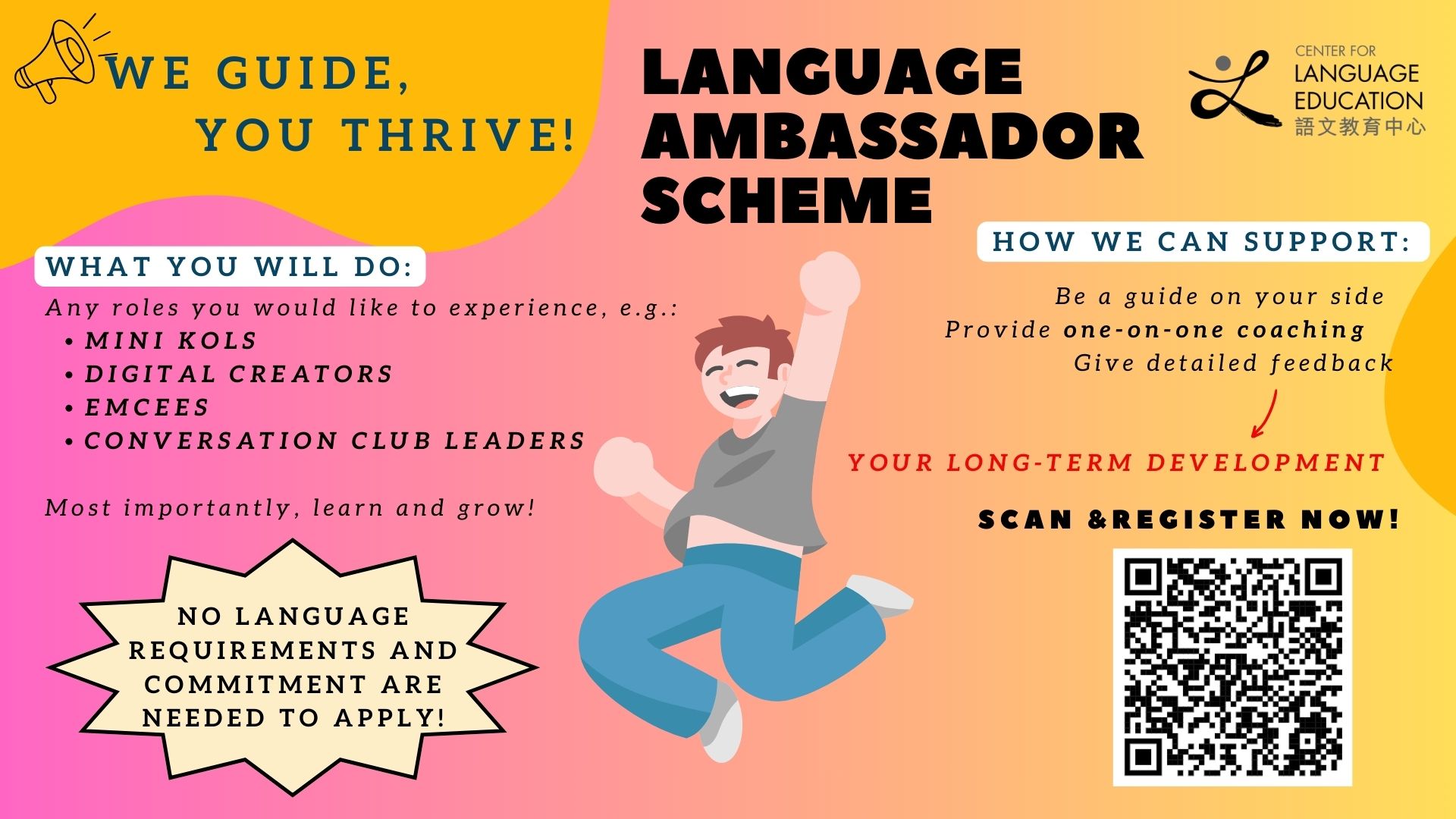 No language requirements are needed to apply. Certificates of recognition will be awarded to dedicated ambassadors. |